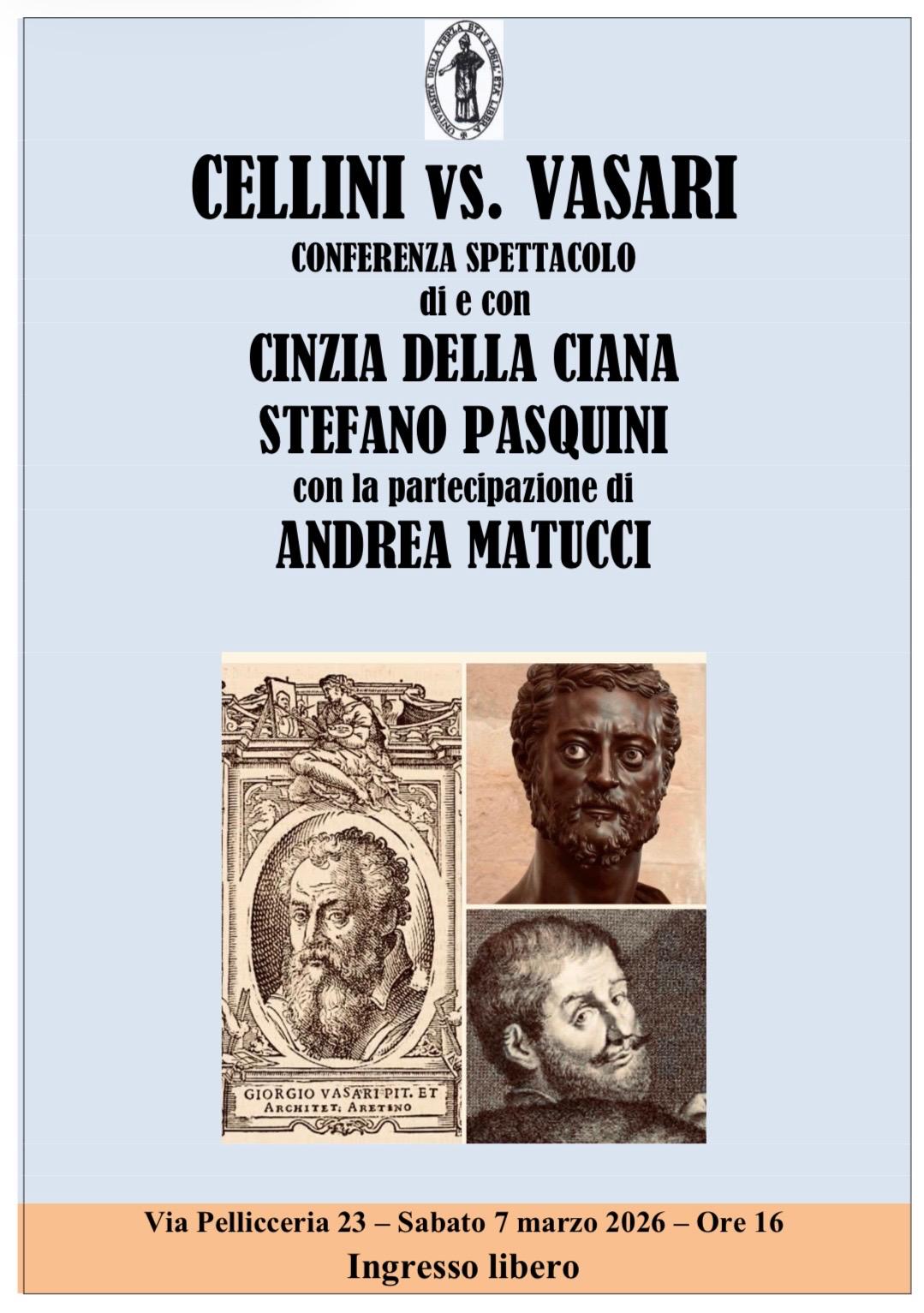 Al centro dell’incontro, il confronto per il primato tra Benvenuto Cellini e Giorgio Vasari, simboli di due visioni dell’arte e di due personalità forti, da sempre in competizione. In un’ampia cornice storica curata da Stefano Pasquini, prenderà voce un dialogo serrato e dai toni accesi, composto da Cinzia Della Ciana e interpretato con Andrea Matucci.